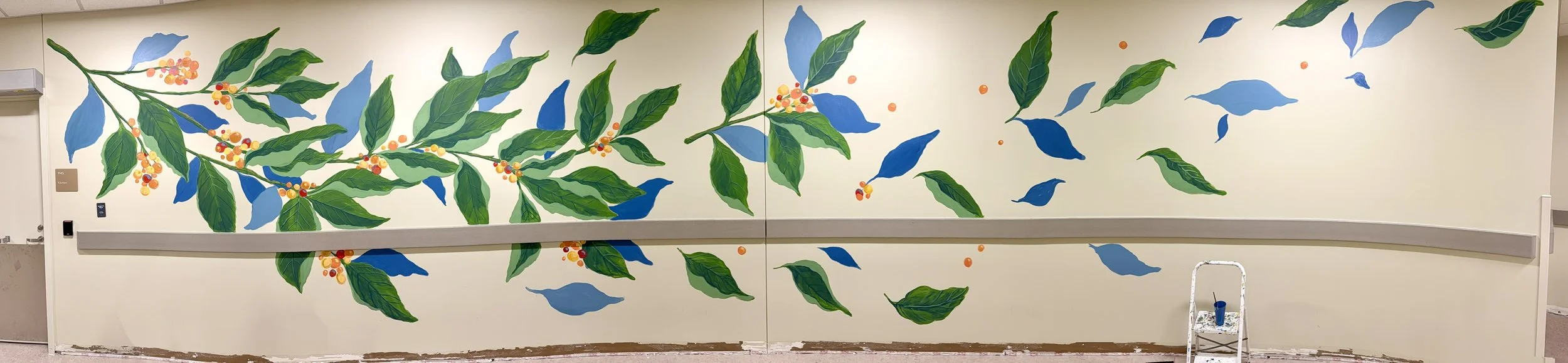 A branch of juneberry in the wind! Along this hallway the breeze shakes the branch and carries sprigs, leaves and berries away with it. This piece was designed to complement the two other juneberry pieces I installed on site in late 2025.